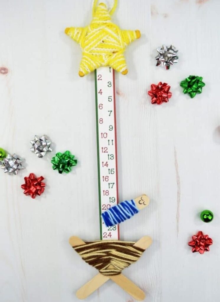 This adorable DIY advent countdown calendar is a sweet way to help toddlers develop patience on the fun up to Christmas. Each day, the yarn-wrapped baby Jesus gradually descends a little further from the star to the manger.