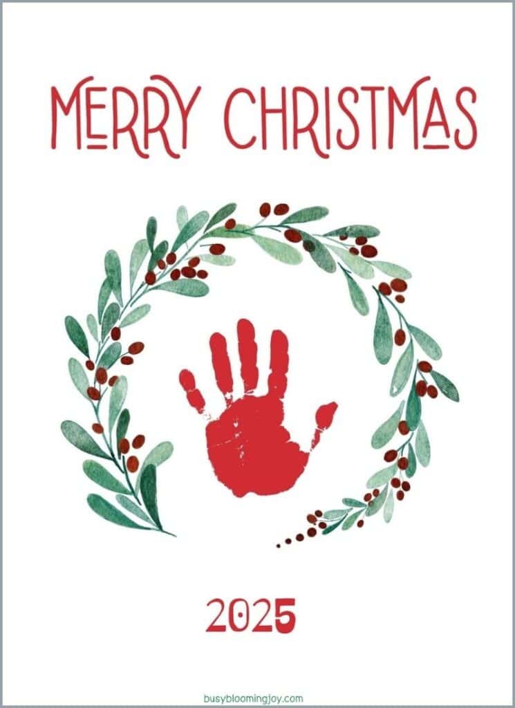 A festive wreath with a handprint in the center makes a cute Christmas keepsake. Use the free printable version for an easy toddler Christmas craft that you can display at home.