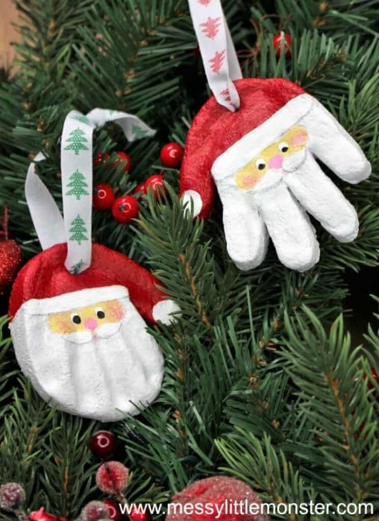 Mix up some salt dough and press in your toddlers hands to shape these festive Santas. Such sweet DIY Christmas handprint crafts that you can hang on the tree year after year.