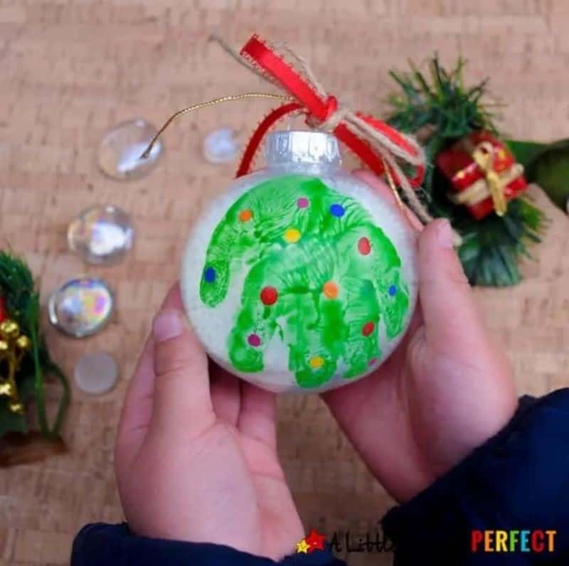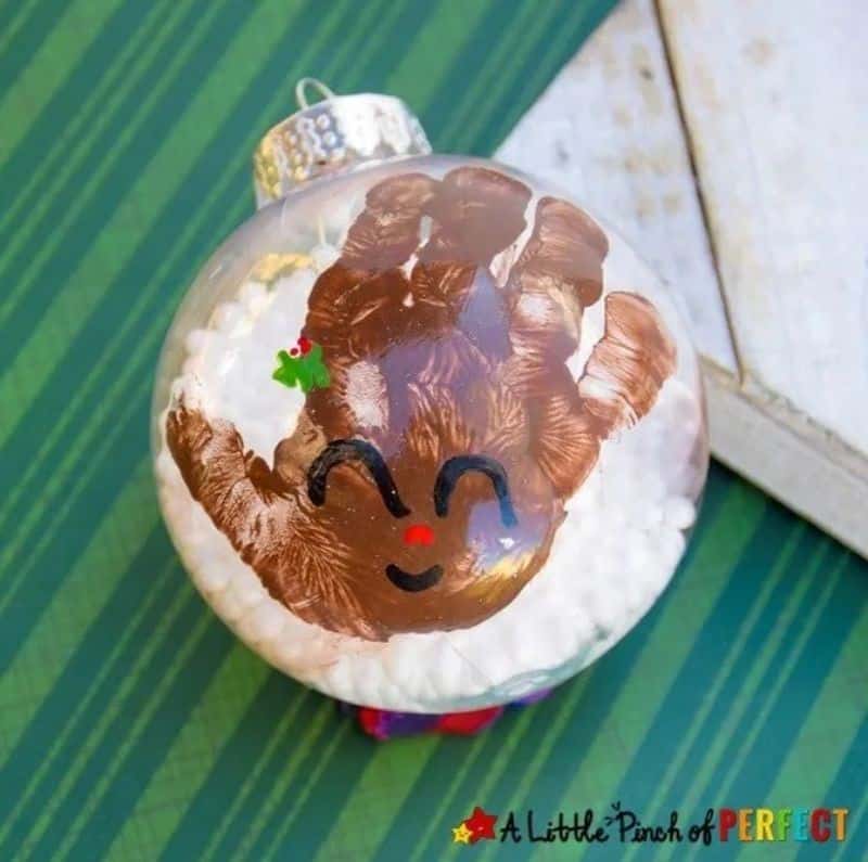 Your child’s handprint and a plastic ornament becomes a sweet little tree-printed decoration for the Christmas tree! Such an easy handprint Christmas craft that kids will be proud to hang on the tree.