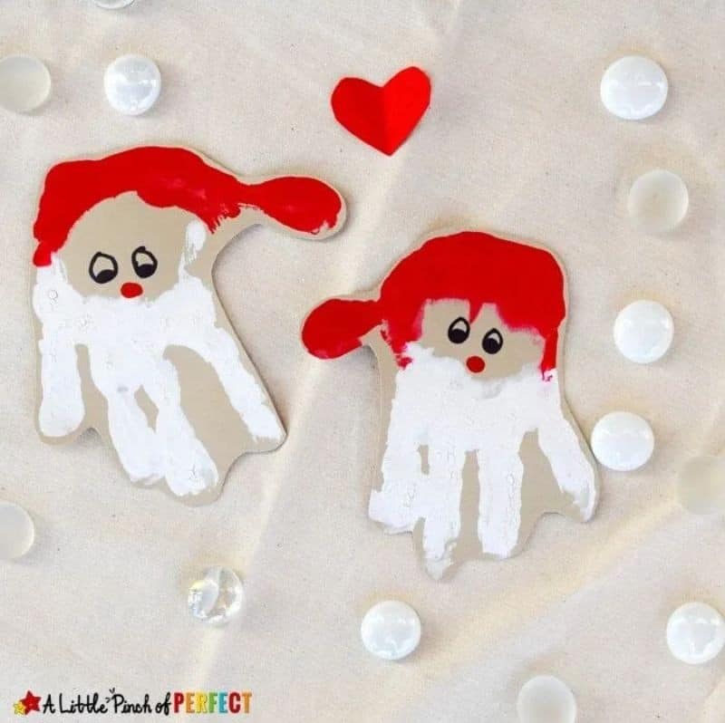 How cute are these! Kids use their hands to create gnome beards, then add the hat on top. A silly, fun, and creative twist on handprint holiday crafting.