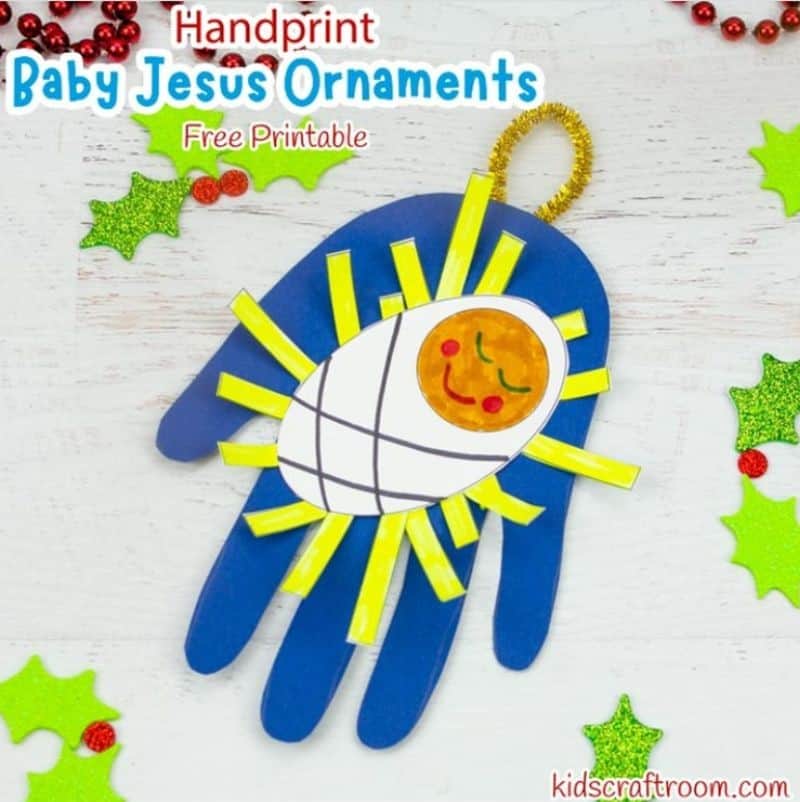 If you’re looking for Christmas handprint crafts for kids that celebrate and share the true meaning behind the festivities, look no further than this baby Jesus ornament. It’d also make a lovely card front.