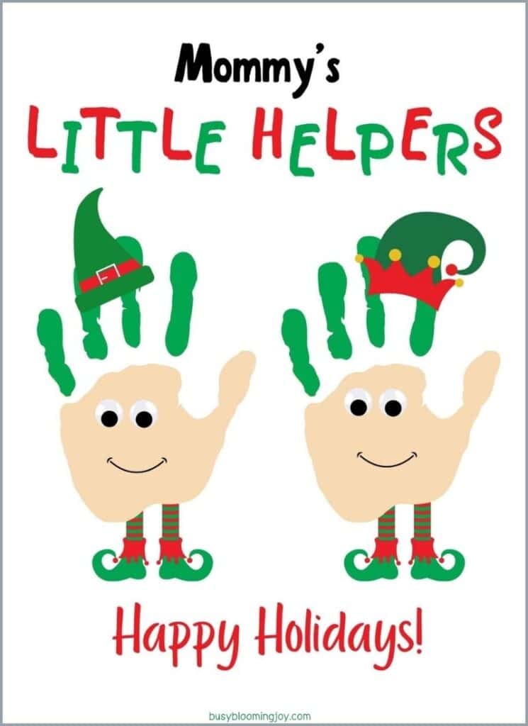 Turn handprints into cheerful little elves with this printable craft. Perfect for remembering those busy little Christmas helpers.