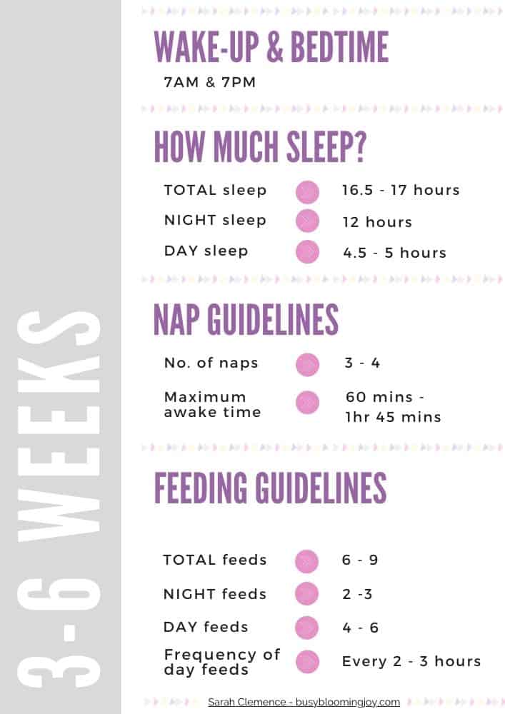 If you want to progress to a more structured schedule with fixed feeding and nap times, and your baby is now feeding every 3 hours check out the ultimate newborn feed and sleep schedule, with age by stage guides.